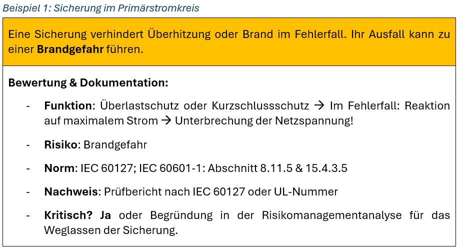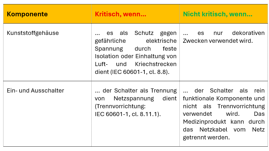 Wichtig: Nicht jedes Bauteil ist automatisch eine kritische Komponente. Die Relevanz ergibt sich nicht aus dem Bauteiltyp selbst, sondern aus seiner Funktion im Medizinprodukt. Eine Komponente gilt als kritisch, wenn ihr Ausfall zu einem unvertretbaren Risiko führt.